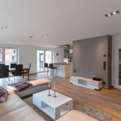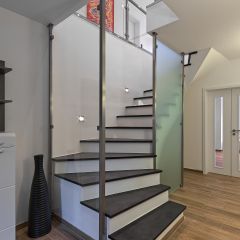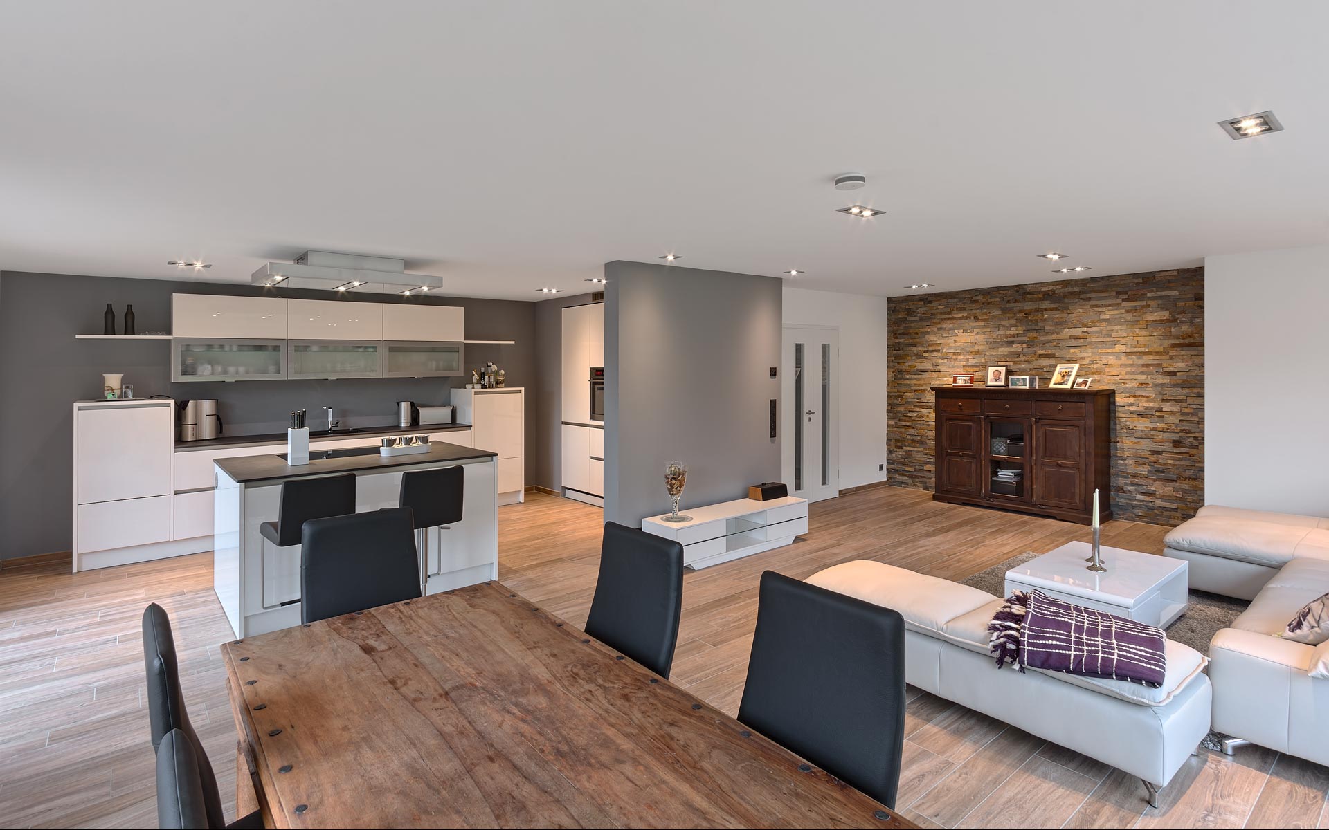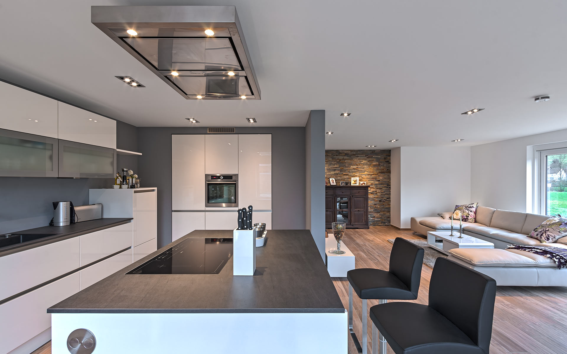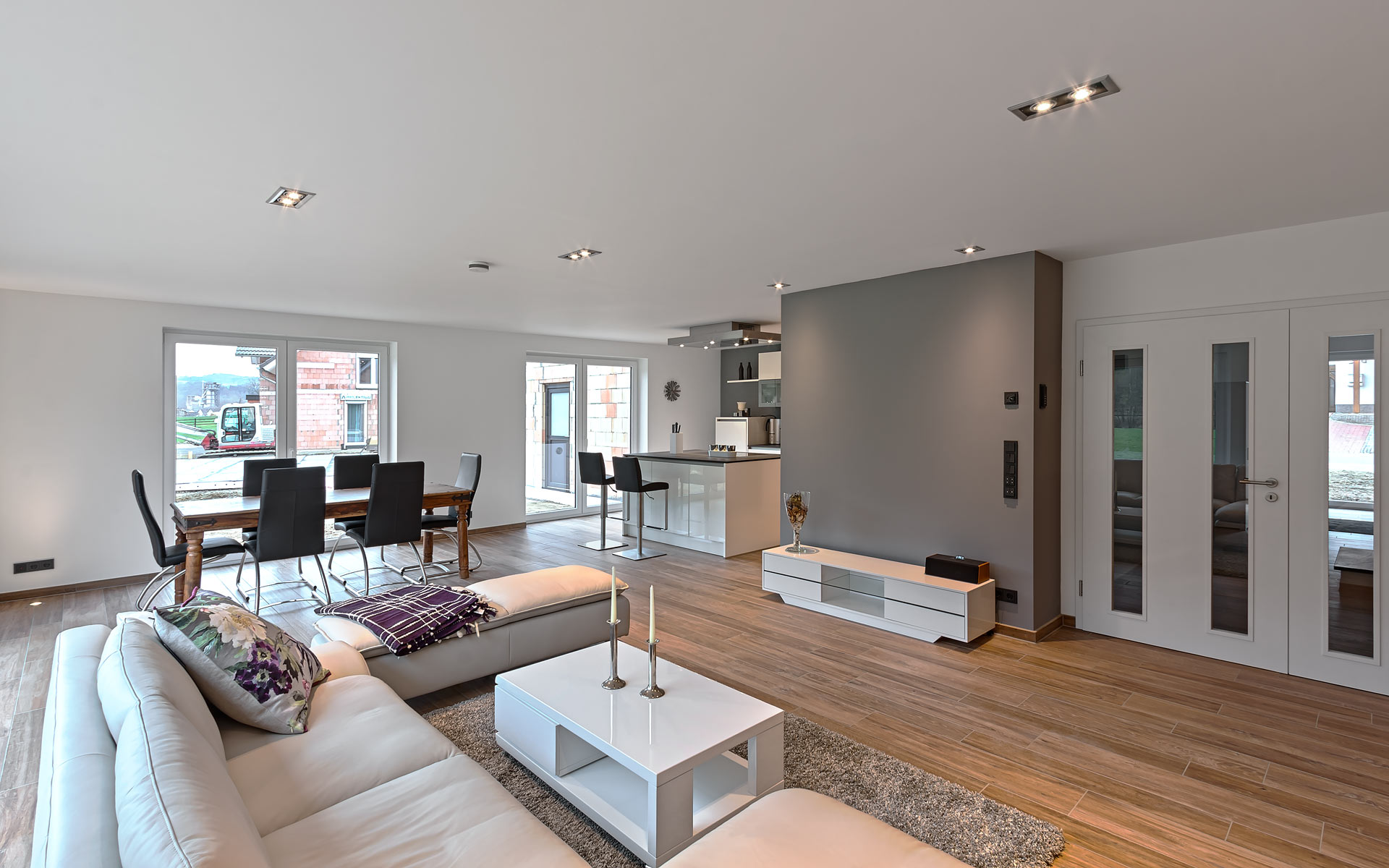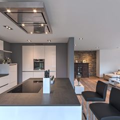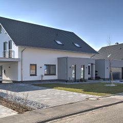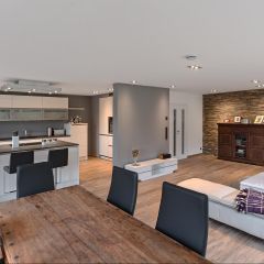 Aufgabenstellung der Bauherrschaft war, ein lichtdurchflutetes, offenes Wohnkonzept über 2 Etagen zu schaffen, welches eine moderne und klare Außensprache spricht. Mittels Kuben, die an die klare Struktur des Gebäudekörpers angepasst worden sind, öffnen sich alle Wohn- und Lebensbereiche in Richtung Süd und West.