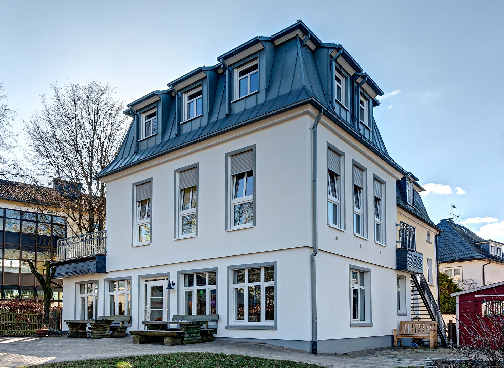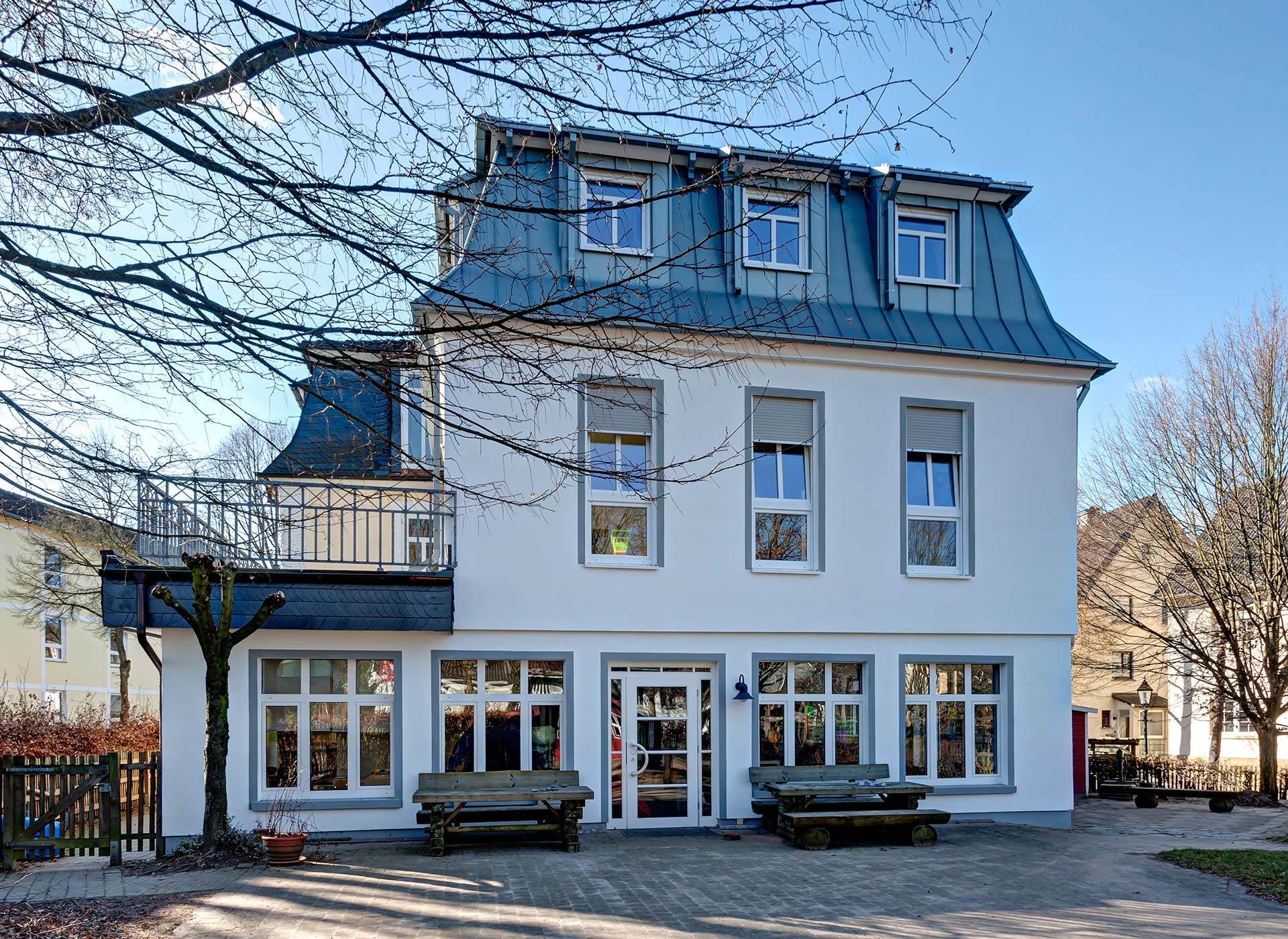 Einerseits das bestehende, imposante Gebäude in Form einer Stadtvilla, deren Verschandelung es um allen Umständen entgegen zu wirken bedurfte, städtische Vorgaben aufgrund von bestehenden Altstadtsatzungen etc. und andererseits ein vom Träger gewünschtes Raumkonzept, welches eine deutliche Erweiterung der Arbeitsmöglichkeiten ergeben sollte. Die ganzheitliche Lösung sollte hell, strukturiert und nahe an Kinderbedürfnissen umgesetzt werden.